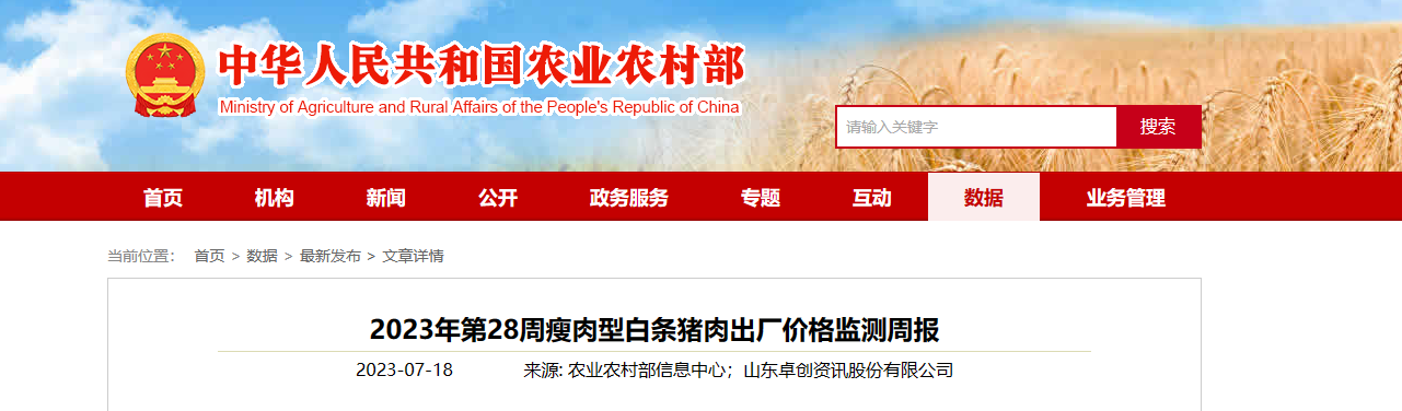 據(jù)農(nóng)業(yè)農(nóng)村部信息中心和山東卓創(chuàng)資訊股份有限公司聯(lián)合監(jiān)測,2023年第28周(即2023年7月10日-7月14日,以下簡稱本周),16省(直轄市)瘦肉型白條豬肉出廠價格總指數(shù)的周平均值為每公斤18.13...