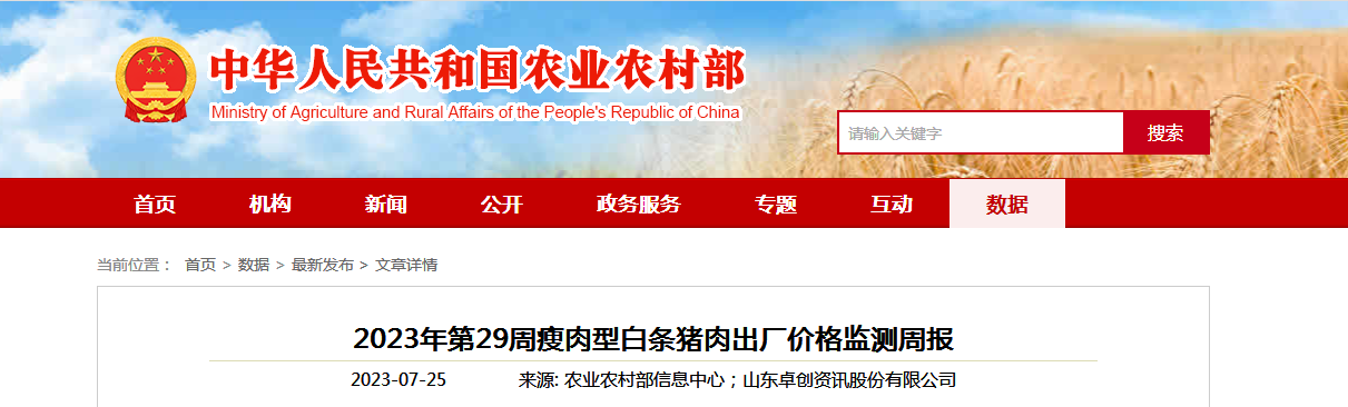 2023年第29周瘦肉型白條豬肉出廠價格監(jiān)測周報...